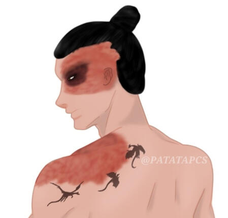 ∆ Las llamas con las que le atacó su padre le quemaron el lado izquierdo de su rostro y hombro.